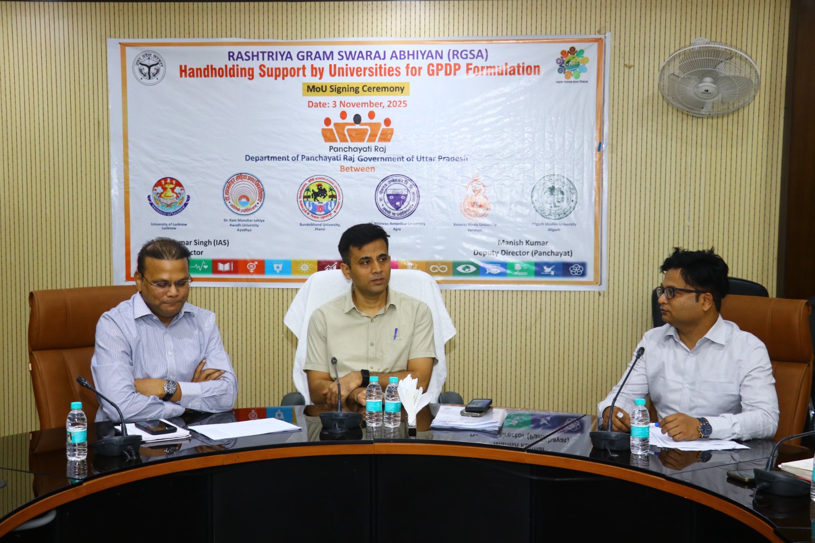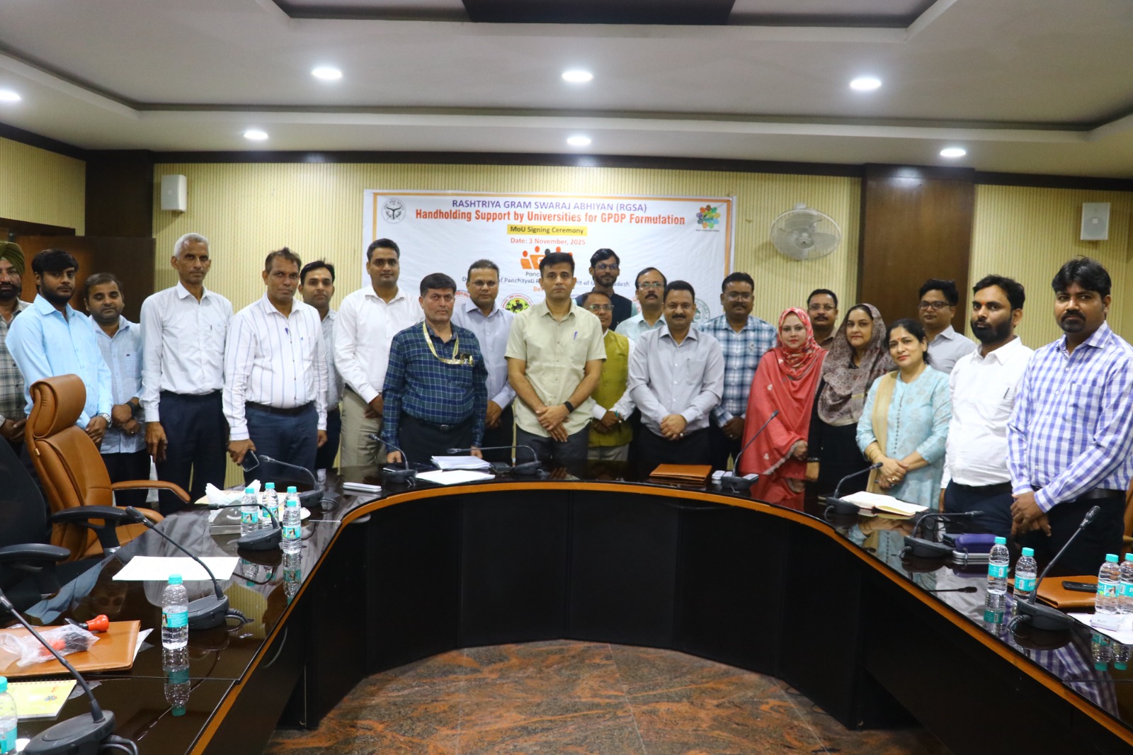 पंचायती राज विभाग, उत्तर प्रदेश शासन एवं राज्य के छह प्रमुख विश्वविद्यालयों के मध्य आज मॉडल ग्राम पंचायत विकास योजनाओं (ळच्क्च्े) के निर्माण हेतु समझौता ज्ञापन (डवन्) पर हस्ताक्षर किए गए। यह ऐतिहासिक पहल राष्ट्रीय ग्राम स्वराज अभियान (त्ळै।) के अंतर्गत आगामी वित्तीय वर्ष 2026-27 के लिए की गई है, जिसके तहत राज्य के 75 जनपदों की 750 ग्राम पंचायतों को चयनित किया गया है।