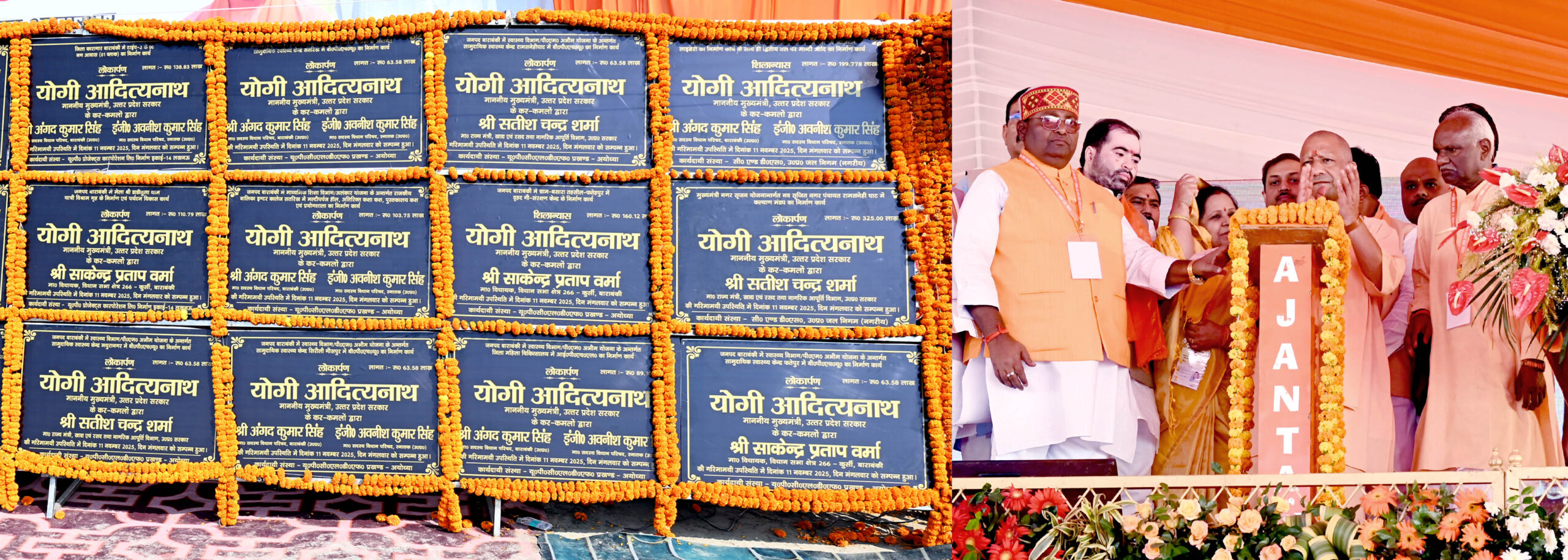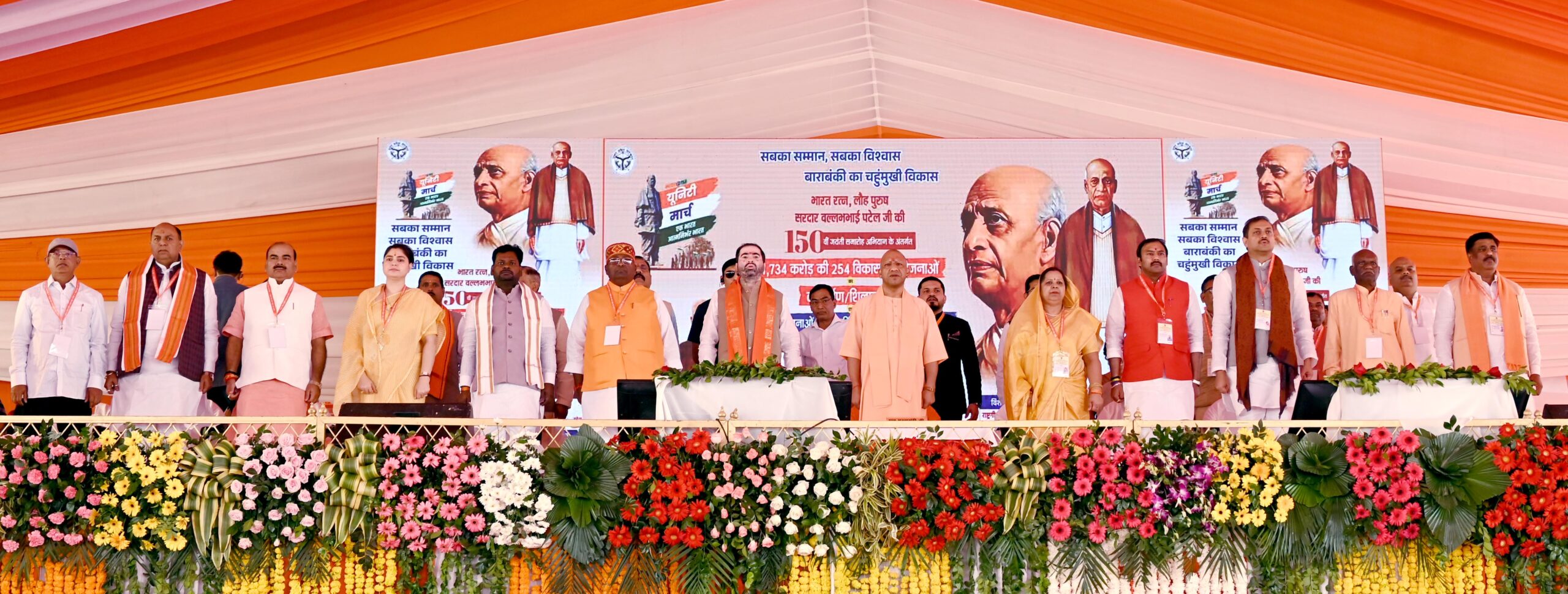 मुख्यमंत्री आज जनपद बाराबंकी में लौहपुरुष सरदार वल्लभ भाई पटेल की 150वीं जयन्ती समारोह अभियान के अन्तर्गत ‘एकता यात्रा’ के शुभारम्भ अवसर पर 1,734 करोड़ रुपये की 254 विकास परियोजनाओं का लोकार्पण एवं शिलान्यास करने के उपरान्त आयोजित कार्यक्रम में अपने विचार व्यक्त कर रहे थे। इसके पूर्व, मुख्यमंत्री ने विभिन्न विभागों द्वारा आयोजित प्रदर्शनी का अवलोकन किया तथा विभिन्न योजनाओं के लाभार्थियों को प्रतीकात्मक चेक/प्रमाण-पत्र वितरित किये। इस अवसर पर उन्होंने सरदार वल्लभ भाई पटेल तथा बाबा साहब डॉ0 बी0आर0 आम्बेडकर की प्रतिमा पर पुष्प अर्पित कर उन्हें श्रद्धांजलि दी तथा बच्चों का अन्नप्राशन भी कराया।
