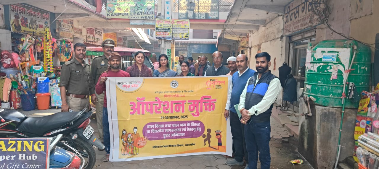 हमीरपुर। आज दिनांक 27-11-2025 को जनपद हमीरपुर में जिला प्रोबेशन अधिकारी राजीव कुमार सिंह के दिशा निर्देश में विकास खंड सुमेरपुर एवं तहसील मौदहा में मिशन शक्ति 5.0 के अंतर्गत बाल श्रम व बाल विवाह की रोकथाम हेतु जागरूकता एवं रेस्क्यू हेतु वृहद अभियान महिला कल्याण विभाग, श्रम विभाग, पुलिस विभाग एवं बाल कल्याण समिति की संयुक्त टीम द्वारा चलाया गया। इस अभियान का मुख्य उद्देश्य जनपद को बाल श्रम व बाल विवाह मुक्त बनाना है। इस दौरान बाल श्रम कर रहे बच्चों को बाल श्रम मुक्त करवाया गया साथ ही दुकानदारों को बाल श्रम न करने की हिदायत देते हुए बाल श्रम के विरुद्ध जागरूक किया गया। उत्तर प्रदेश सरकार द्वारा महिलाओं एवं बच्चों की सहायता हेतु चलाई जा रही हेल्प लाइन 112, 1090, 1098 व 181 के बारे में विस्तार से जानकारी दी गई। उक्त अभियान के दौरान श्रम प्रवर्तन अधिकारी, सुपरवाइजर, थाना प्रभारी, बाल कल्याण समिति की अध्यक्ष, बाल संरक्षण अधिकारी, हब फॉर एंपावरमेंट से जिला समन्वयक एवं जेंडर स्पेशलिस्ट उपस्थित रहे।