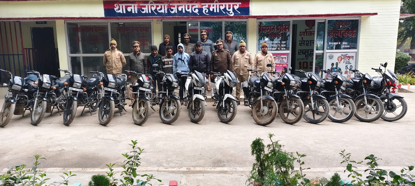 संवाददाता हमीरपुर/सरीला। पुलिस अधीक्षक हमीरपुर के निर्देश पर जनपद में अपराध नियंत्रण एवं अपराधियों के विरुद्ध चलाए जा रहे अभियान के तहत थाना जरिया पुलिस को बड़ी सफलता हाथ लगी है। अपर पुलिस अधीक्षक हमीरपुर एवं क्षेत्राधिकारी सरीला के पर्यवेक्षण तथा प्रभारी निरीक्षक थाना जरिया के नेतृत्व में पुलिस टीम ने अंतर्राज्यीय मोटरसाइकिल चोर गिरोह के चार अभियुक्तों को गिरफ्तार कर उनके कब्जे से 14 चोरी की मोटरसाइकिलें बरामद की हैं।