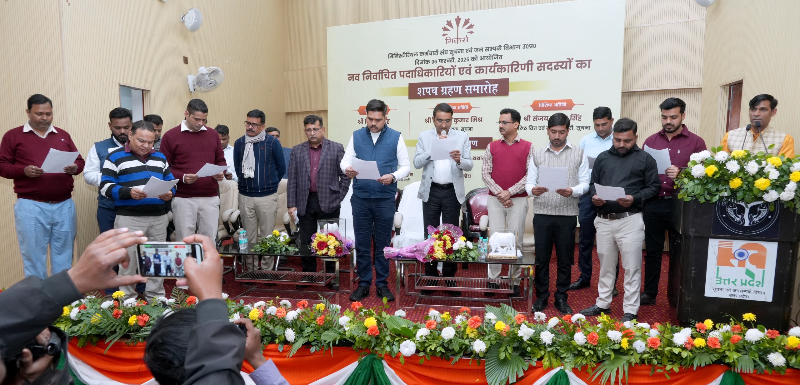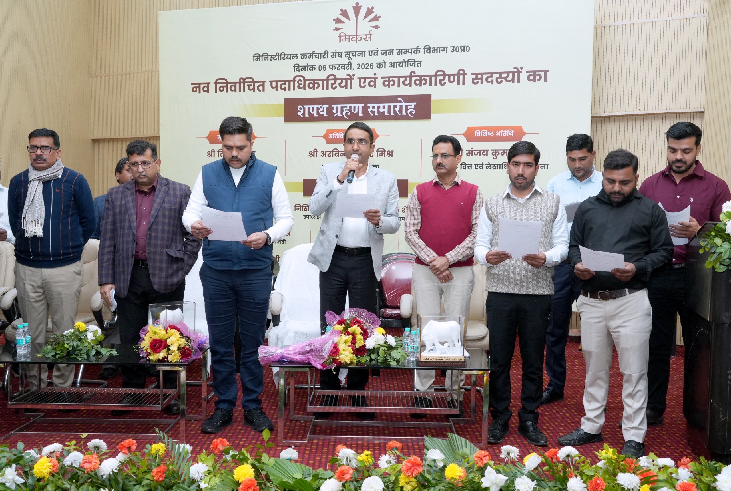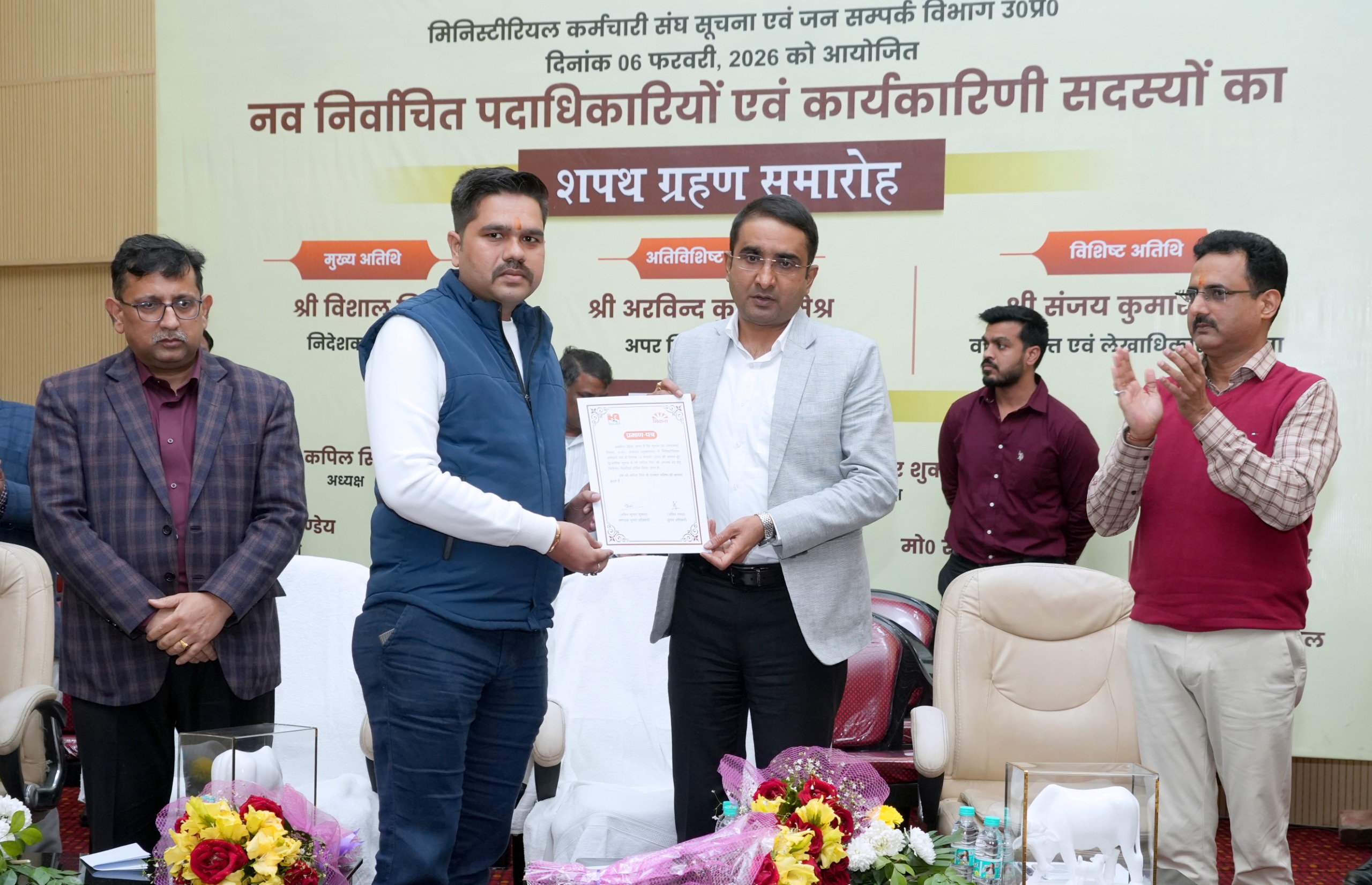 सूचना विभाग के मिनिस्टीरियल कर्मचारी संघ के नवनिर्वाचित पदाधिकारियों के शपथ ग्रहण समारोह का आयोजन शुक्रवार (दिनांक-06.02.2026) को सूचना निदेशालय के सभागार में किया गया। इस अवसर पर निदेशक सूचना श्री विशाल सिंह ने पदाधिकारियों को शपथ दिलाई। साथ ही, प्रमाण पत्र देकर सम्मानित भी किया।