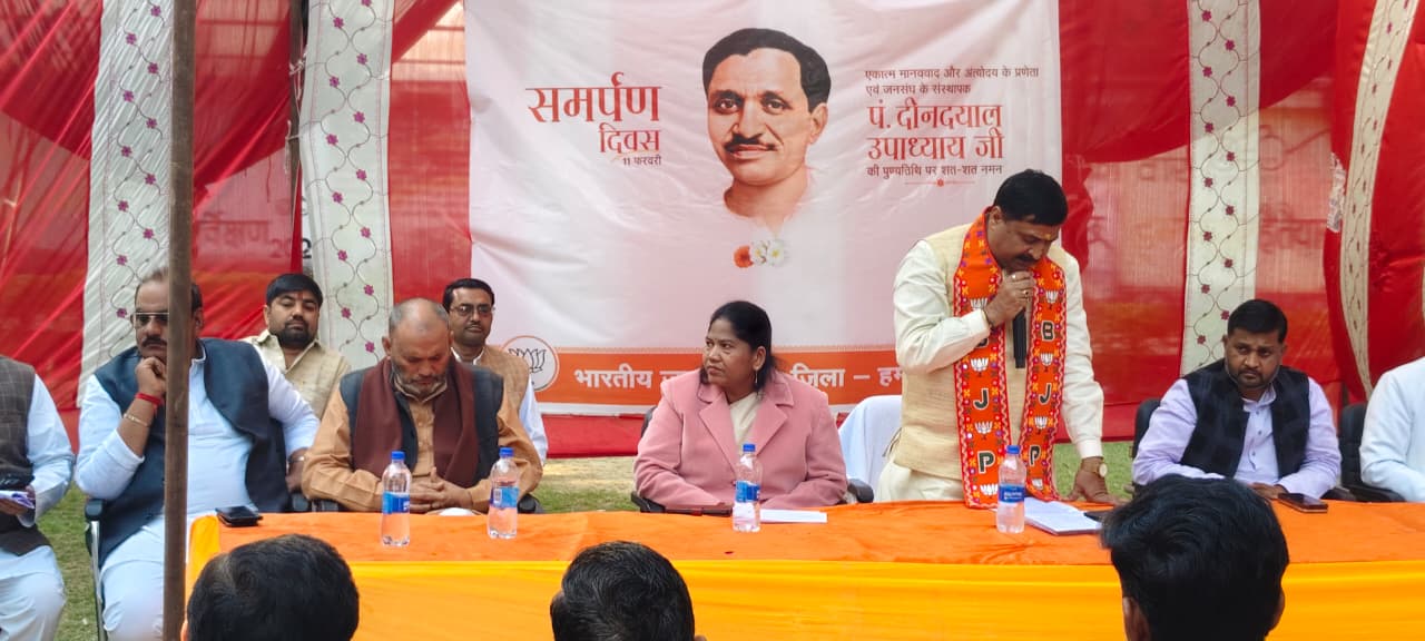 हमीरपुर। अंत्योदय के प्रणेता पंडित दीनदयाल उपाध्याय की पुण्यतिथि पर आज स्थानीय स्तर पर ‘समर्पण दिवस’ का आयोजन किया गया। कार्यक्रम में मुख्य अतिथि के रूप में प्रदेश उपाध्यक्ष पिछड़ा वर्ग मोर्चा जयप्रकाश कुशवाहा जी रहे। अध्यक्षता जिला अध्यक्ष श्रीमती शकुंतला निषाद ने की।